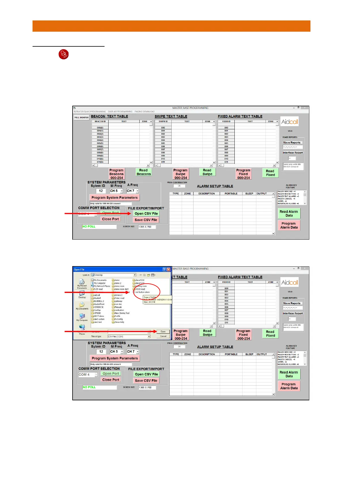 On the Master Base Programming tab; click-on the “Open CSV File” button and select the “red button