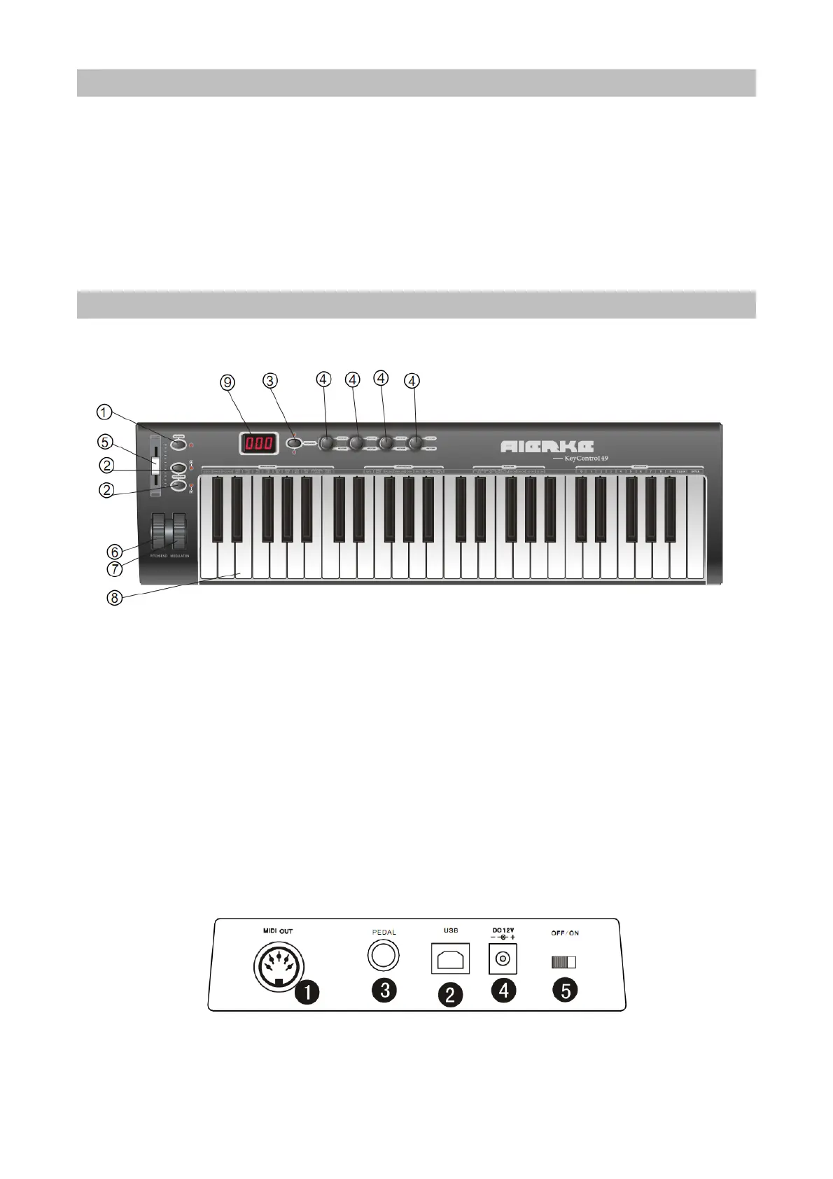 MIDI-Ausgang und USB-Anschluss. Stromversorgung über USB und DC 12V