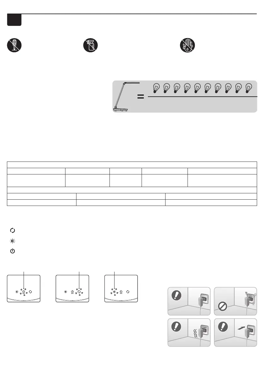 • Den här bordslampan har en armatur av klass II och den kan endast användas med den utrustade LED-styrenheten. Lampan kan endast