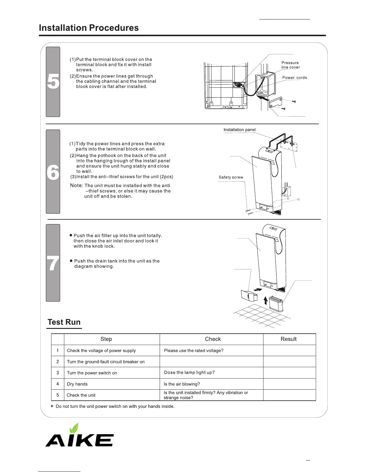 Aike AK2030 - Install the terminal block cover; Fix the unit; Install the air filter; Install the drain tank