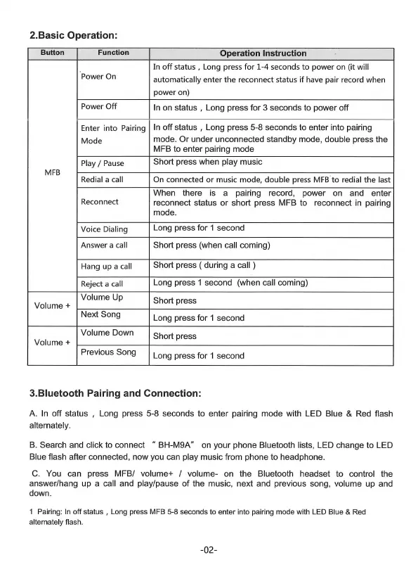 1 Pairing: In off status , Long press MFB 5-8 seconds to enter into pairing mode w