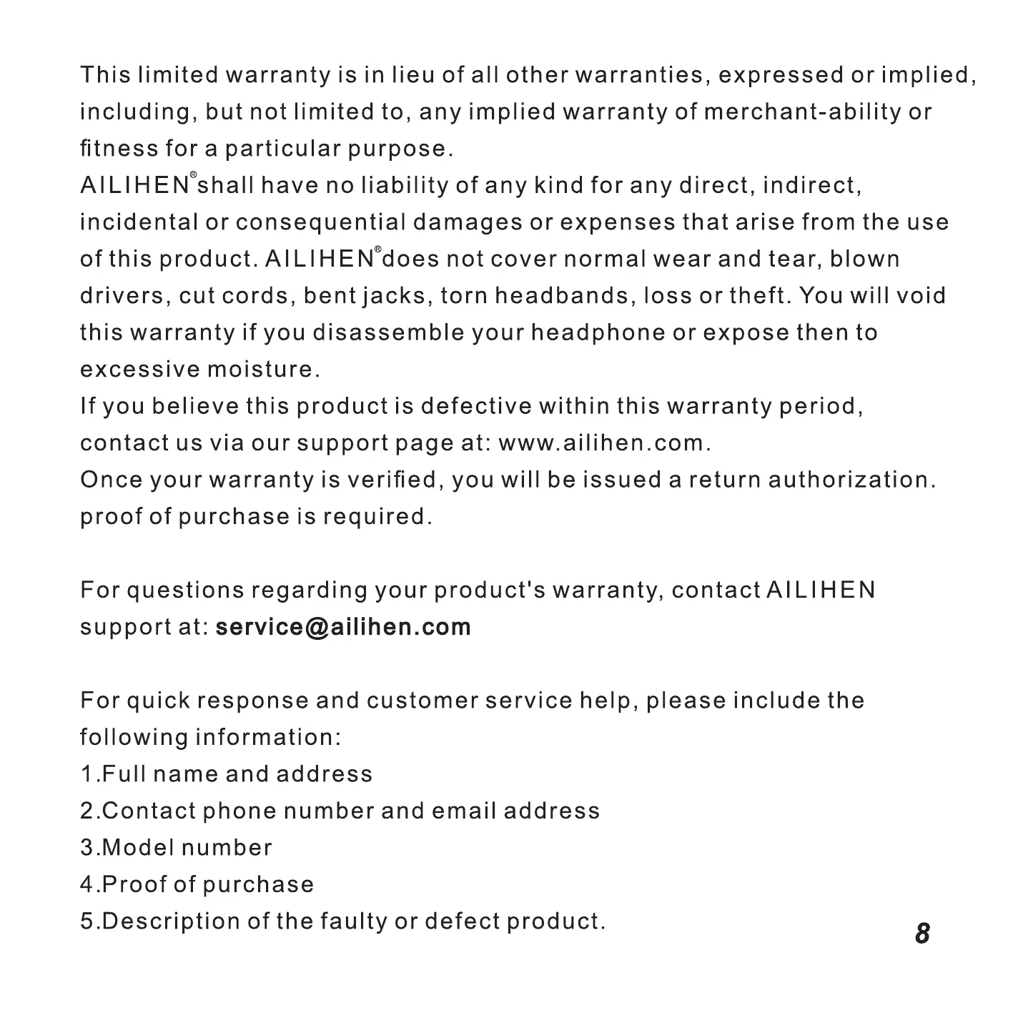 AILIHEN guarantees this product against defects in materials or