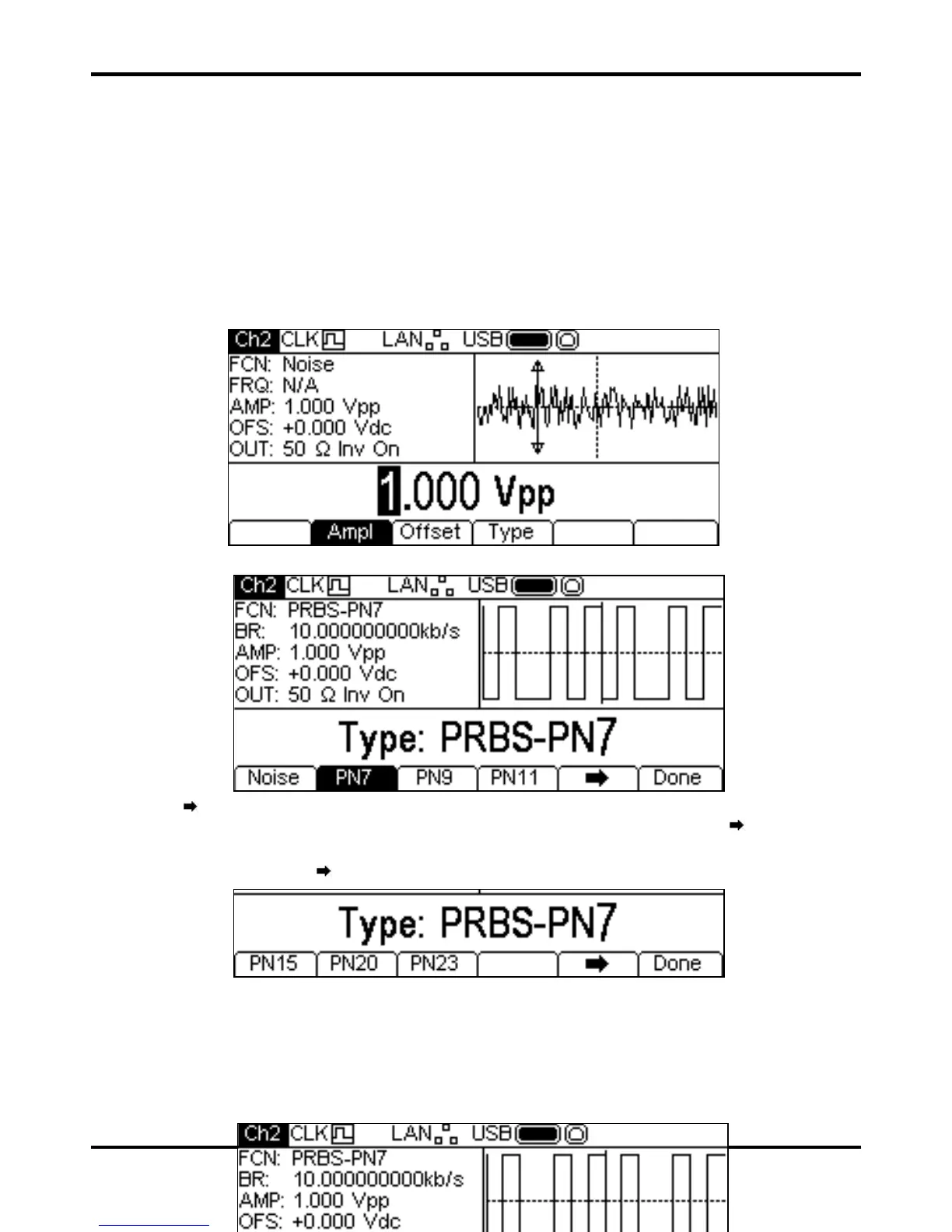 Pressing the Noise/PRBS key will switch to the Noise/PRBS function and show the screen below.