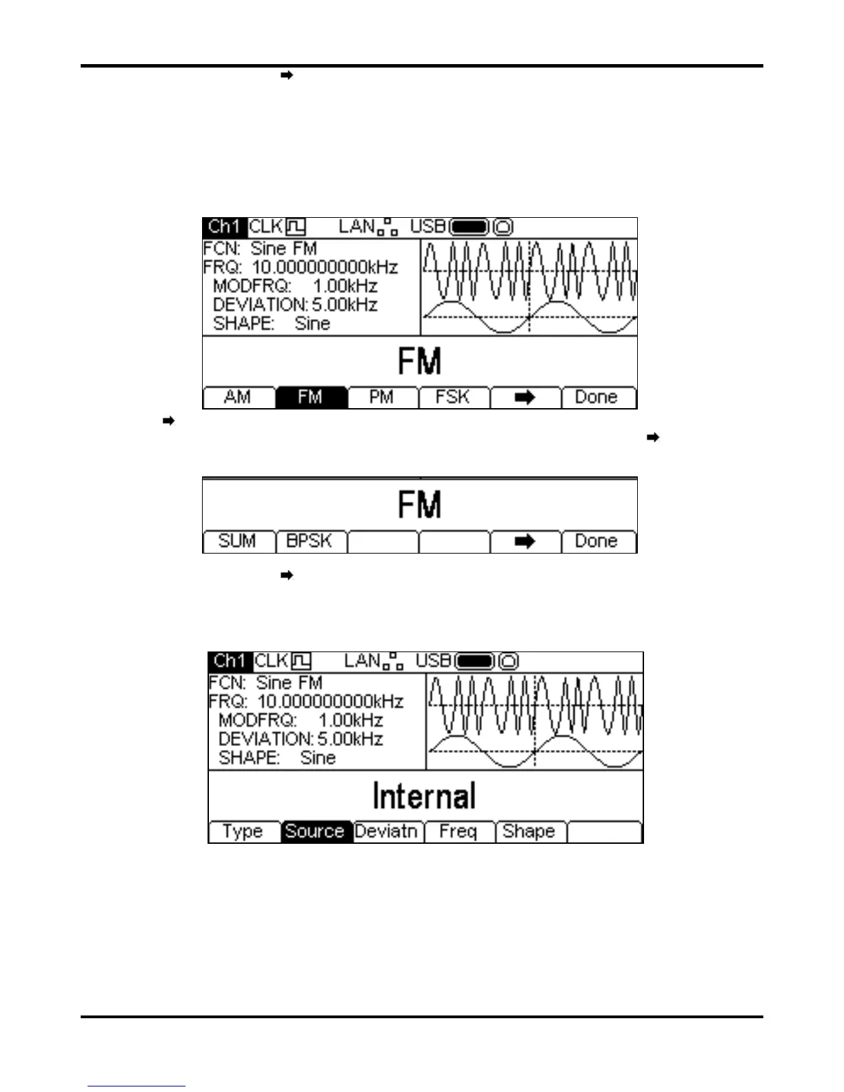 To select FM press the MOD key to turn on modulation and then press the Type soft key to show