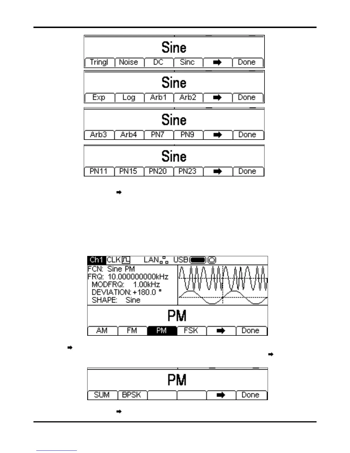 soft-key will show the first list again. Select the modulation shape