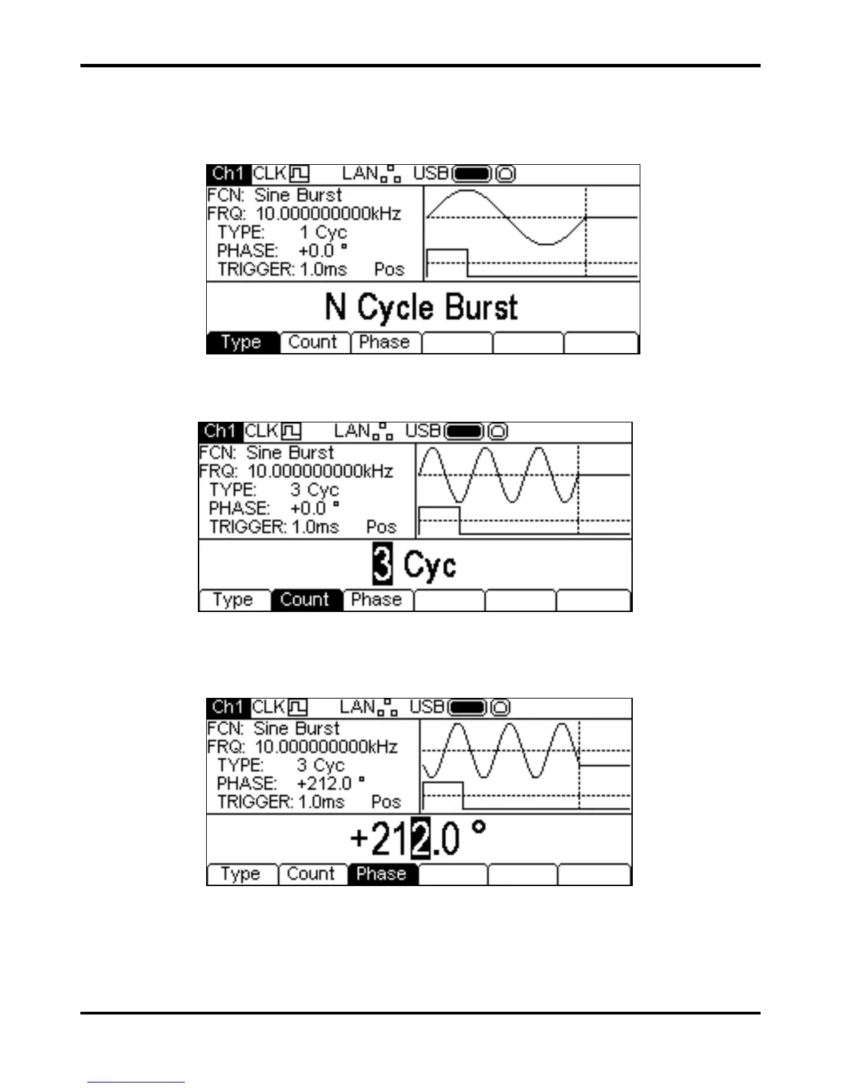 To set the burst type press the Type soft-key. Each press will select the next type from