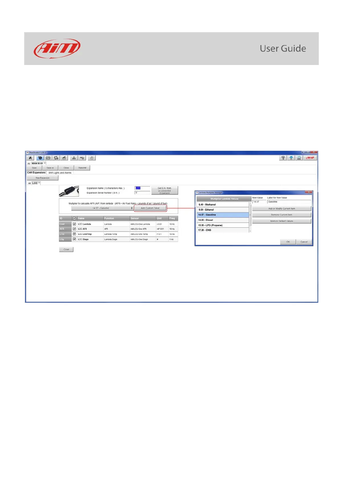 select the multiplier to calculate AFR from lambda (in the example “14.57 Gasoline”) or add a custom value pressing “Add Custom