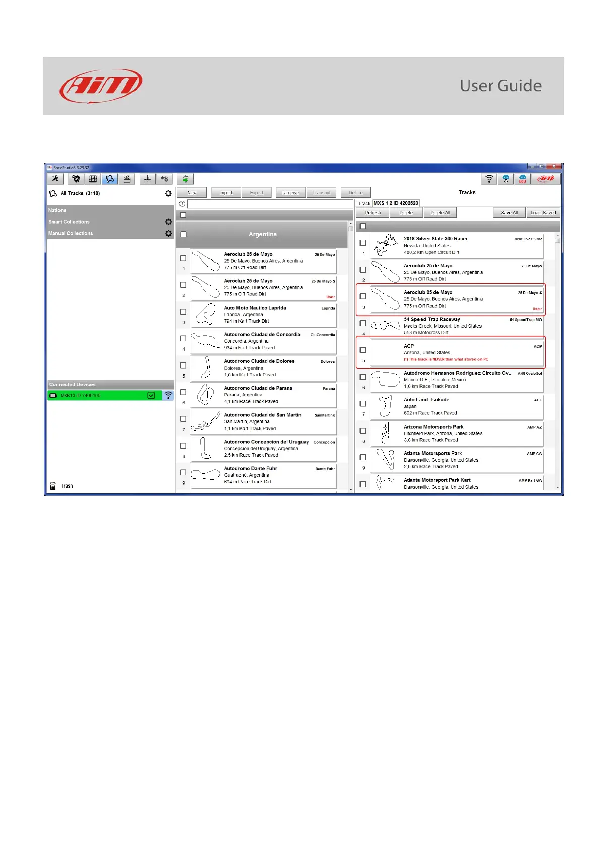 Tracks created by the user are labelled “User” and if the track stored in MXK10 logger is different from the one stored in AiM database this