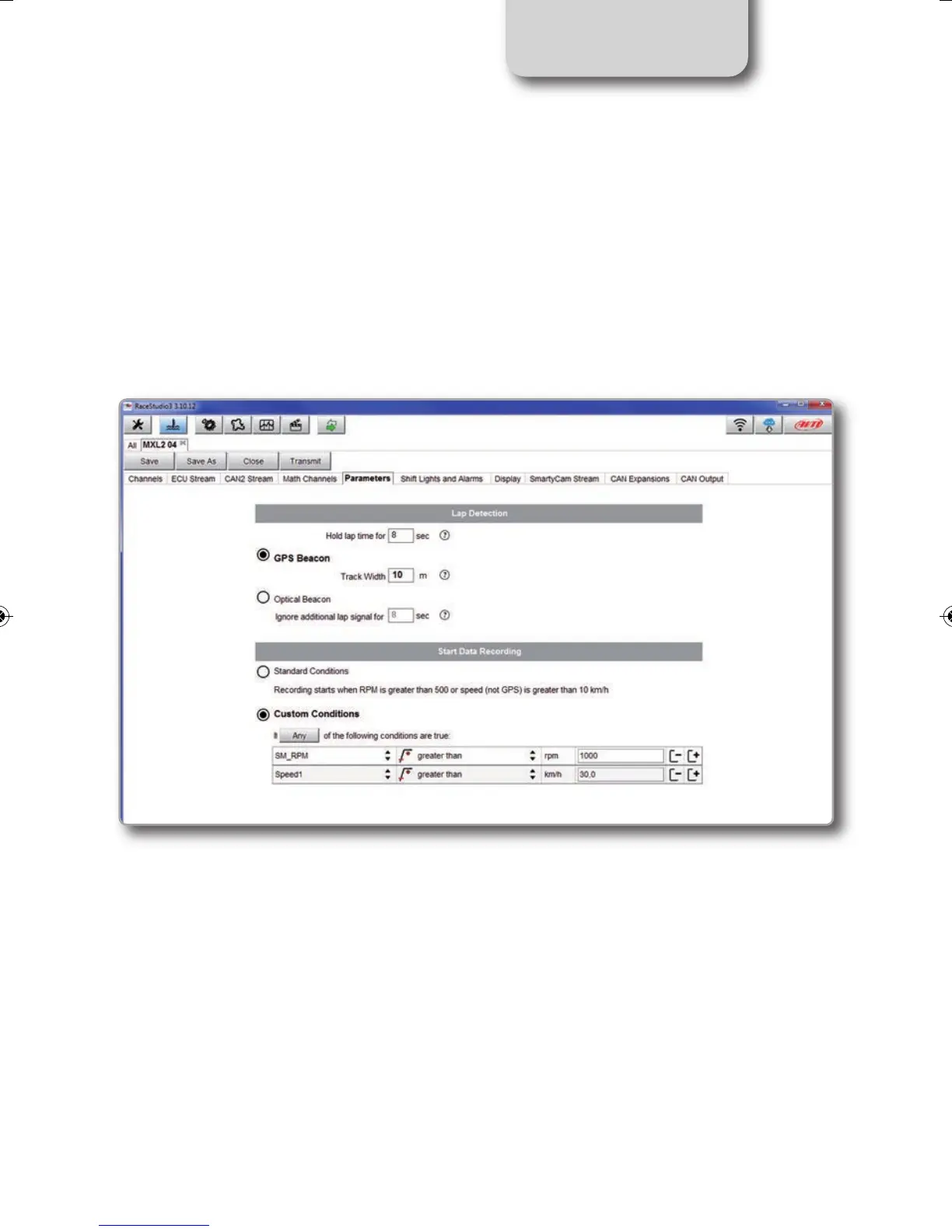 Press "Parameters" tab. Here you can set the lap detection (GPS or Optical beacon) as well as