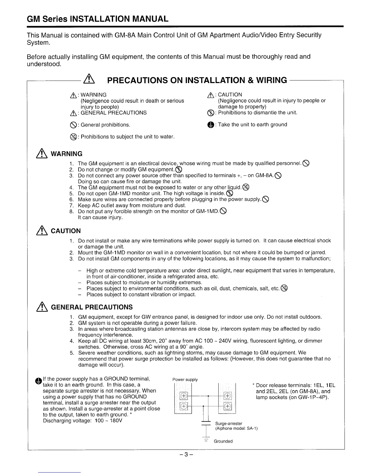 Aiphone GM Series - Precautions on Installation & Wiring; General Precautions