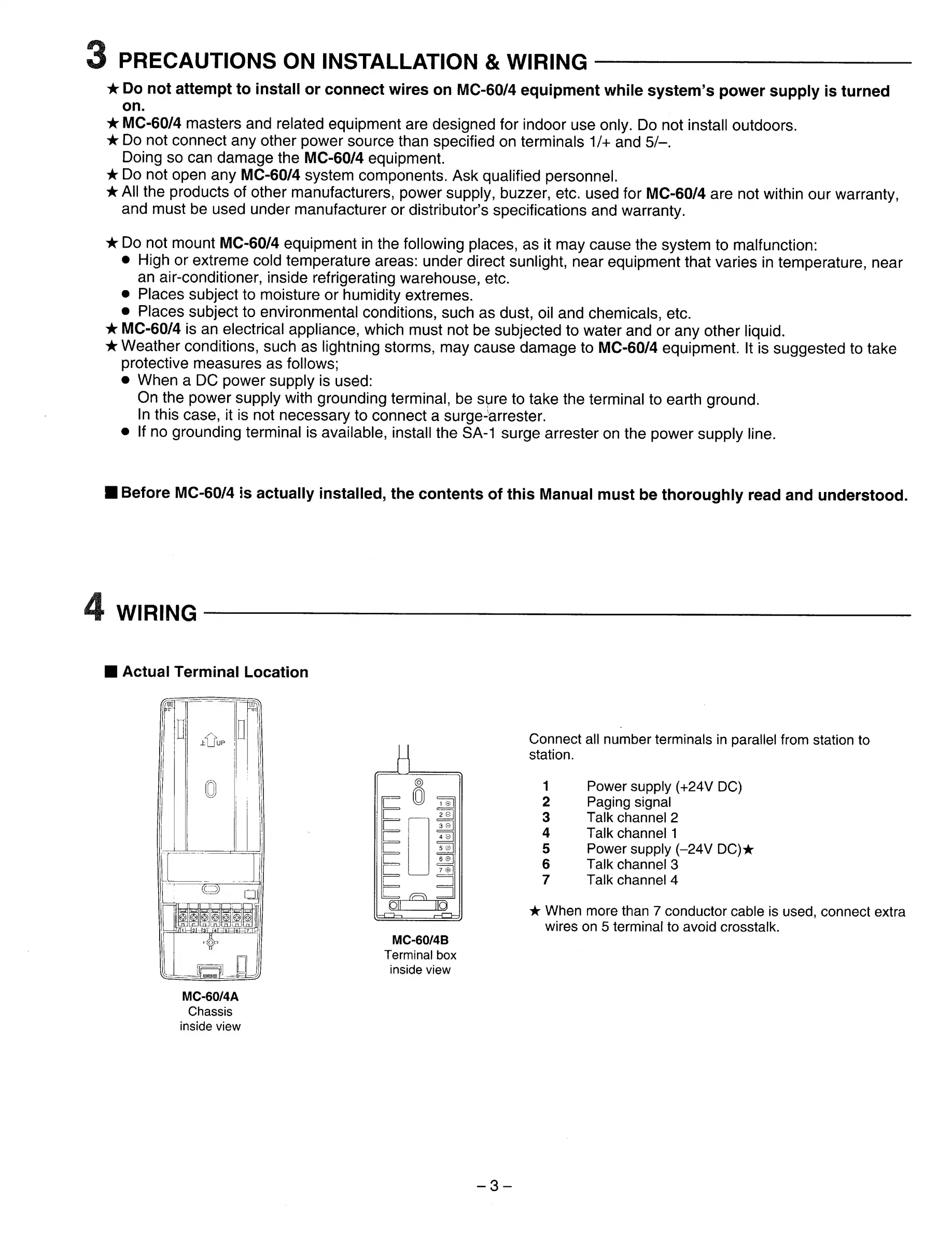 Aiphone MC-60/4A - 3 PRECAUTIONS ON INSTALLATION & WIRING; Installation and Wiring Safety; 4 WIRING; Actual Terminal Location
