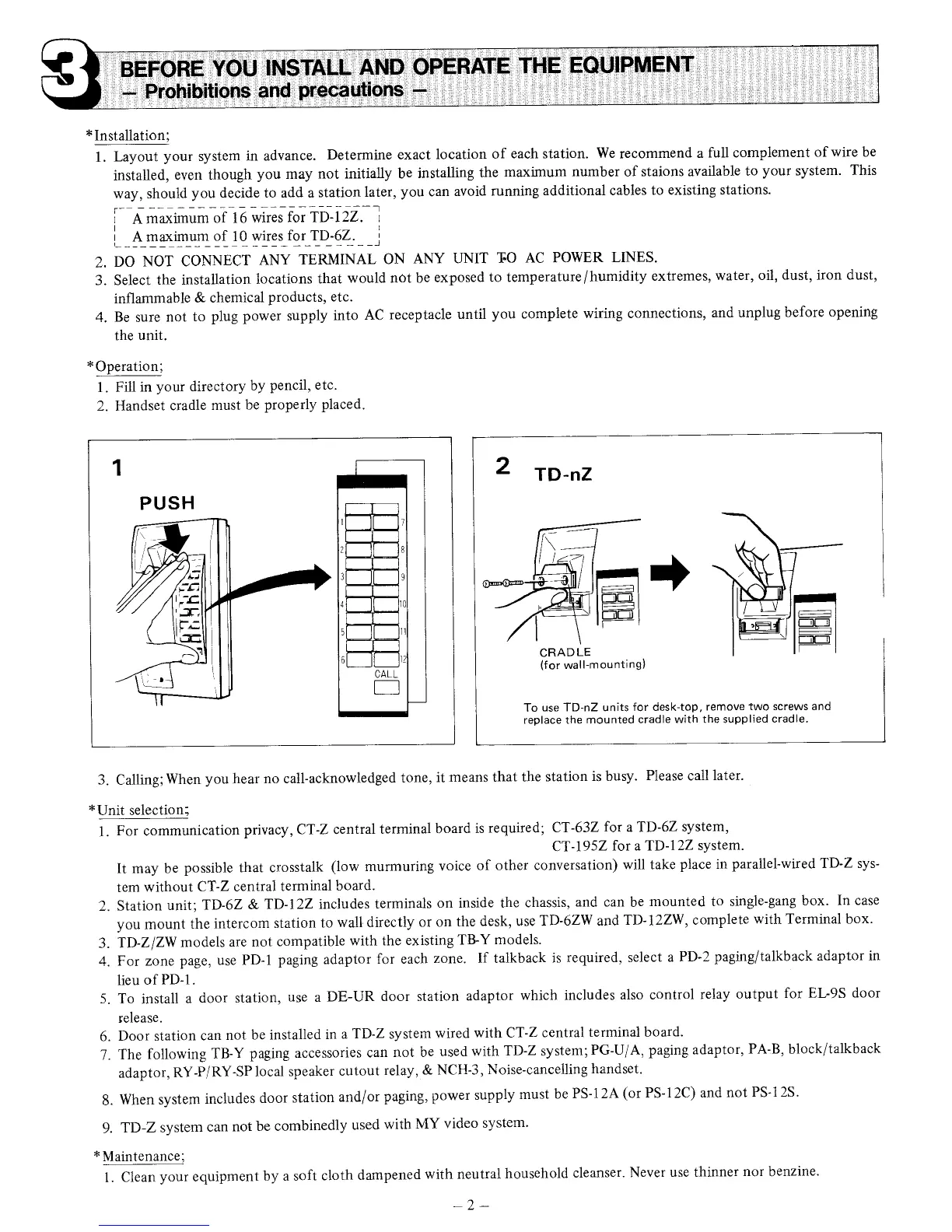 Aiphone TD-12Z - Prohibitions and Precautions; Safe Installation; Unit Selection; Safe Maintenance