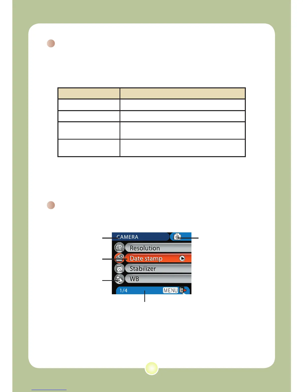 camera functions. The following table gives details on menu