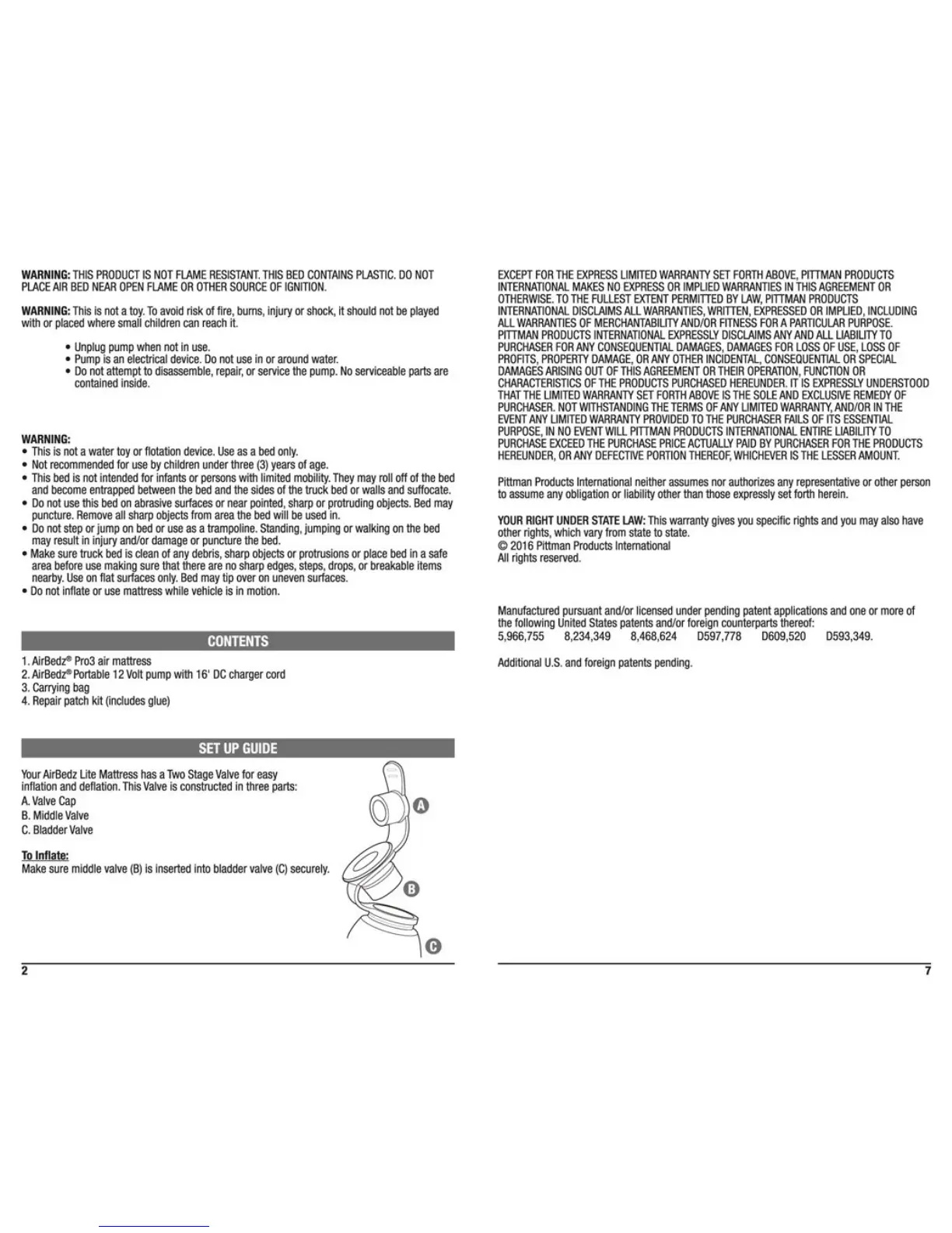 AirBedz Pro 3 - Safety Warnings; General Product Safety; Set Up Guide; Two Stage Valve Description