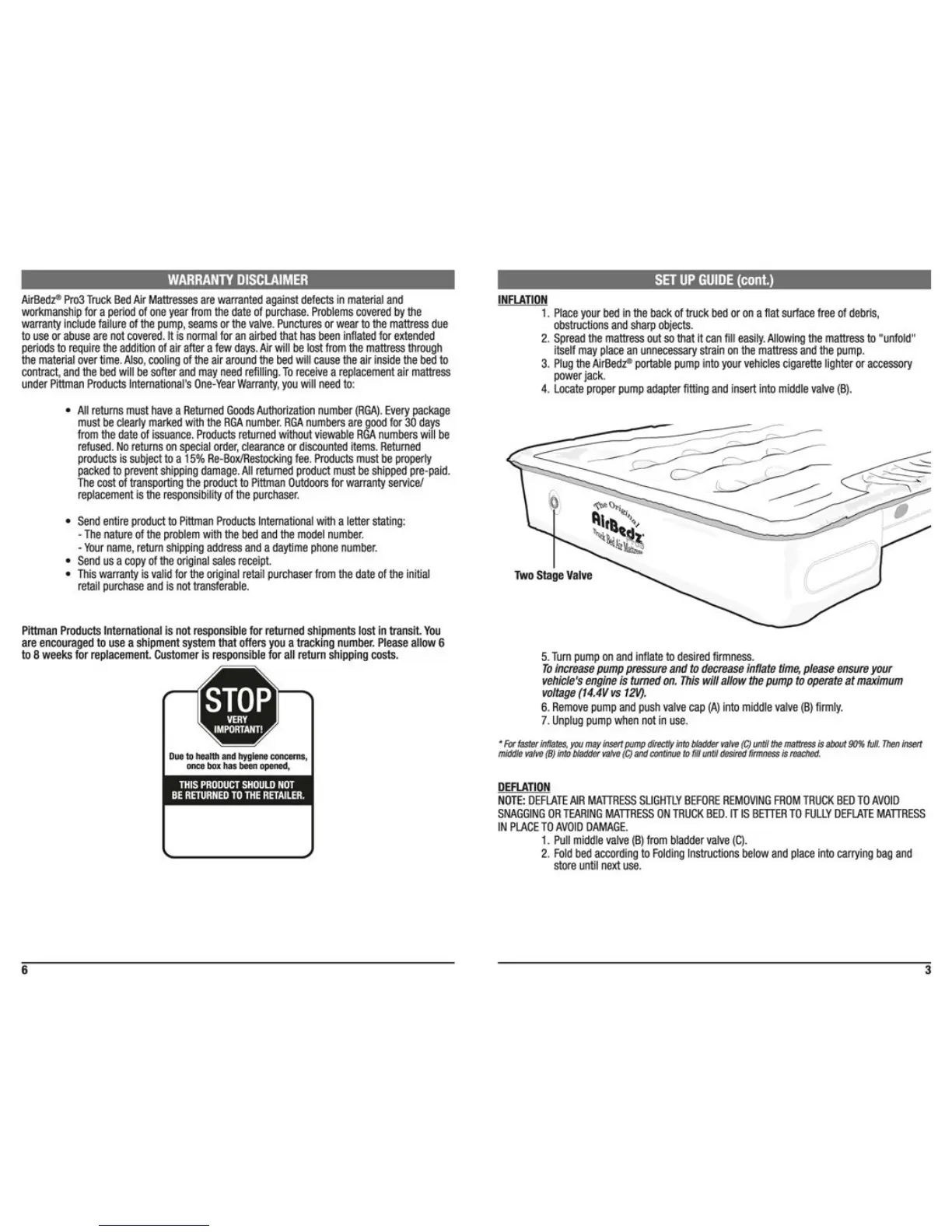 AirBedz Pro 3 - Inflation Process; Deflation Process; Warranty and Returns; Warranty Disclaimer and Coverage