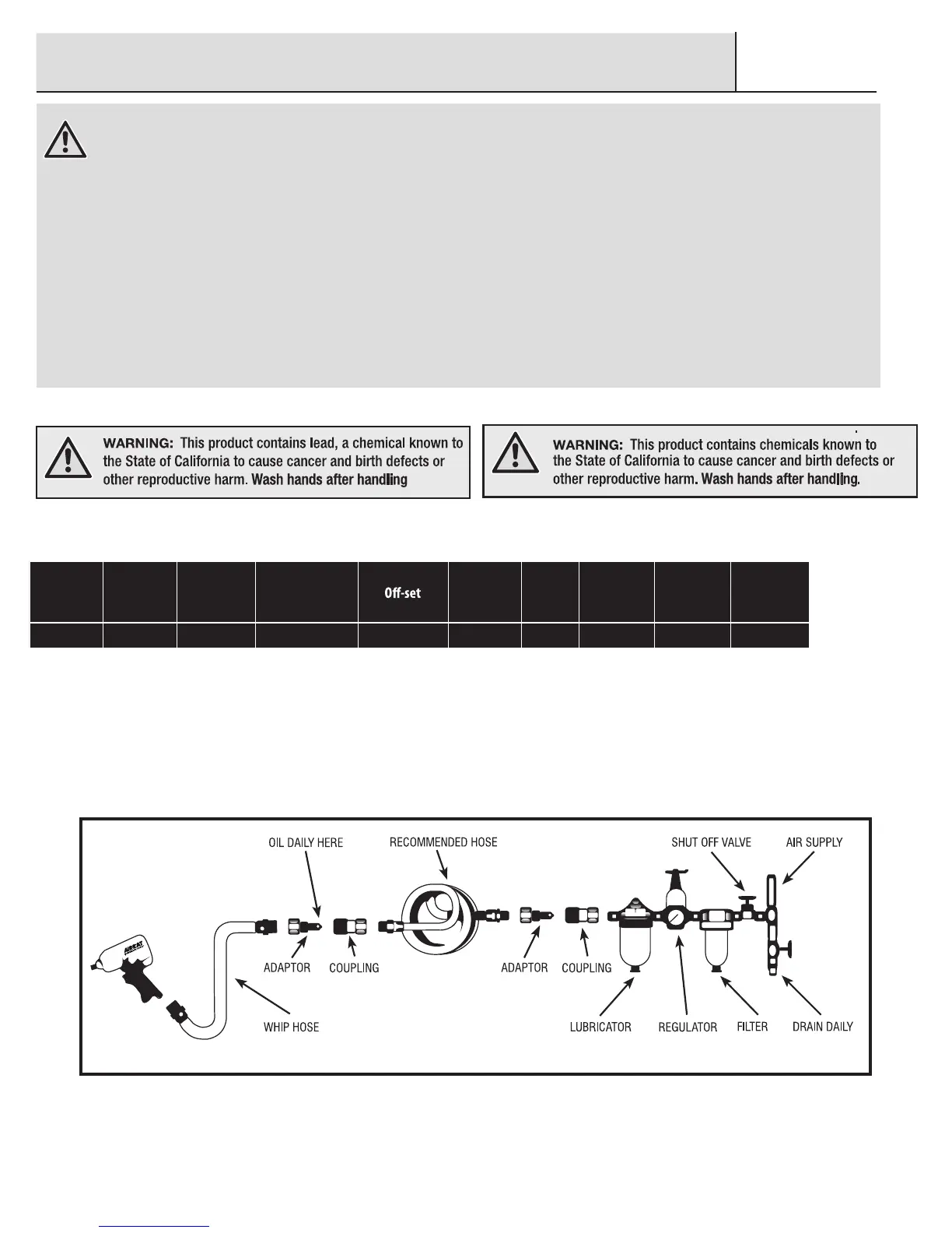 pressure and unclean air will shorten the tool’s life because of faster wear and may create a hazardous condition and void the warranty. Water in the air line will