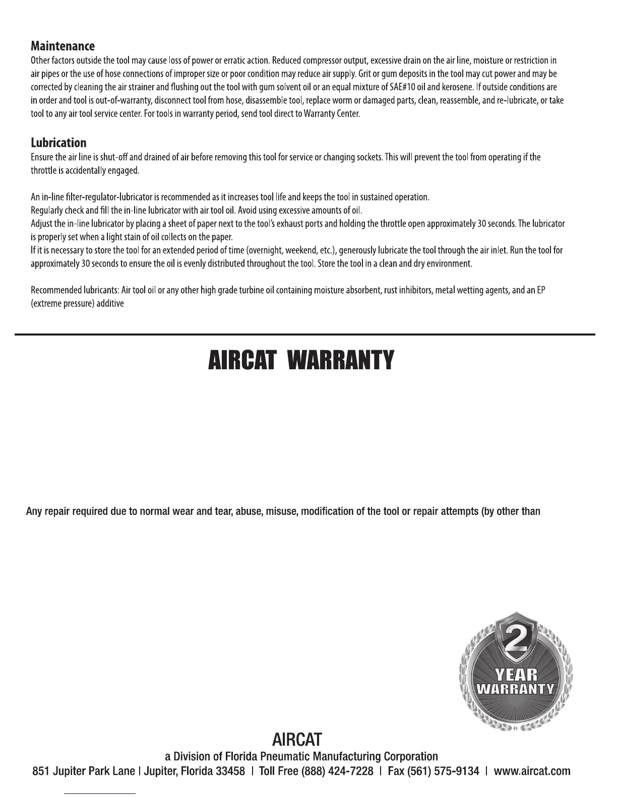 AIRCAT and NITROCAT air tools are warranted to be free from defects in material and workmanship for 2 years from date