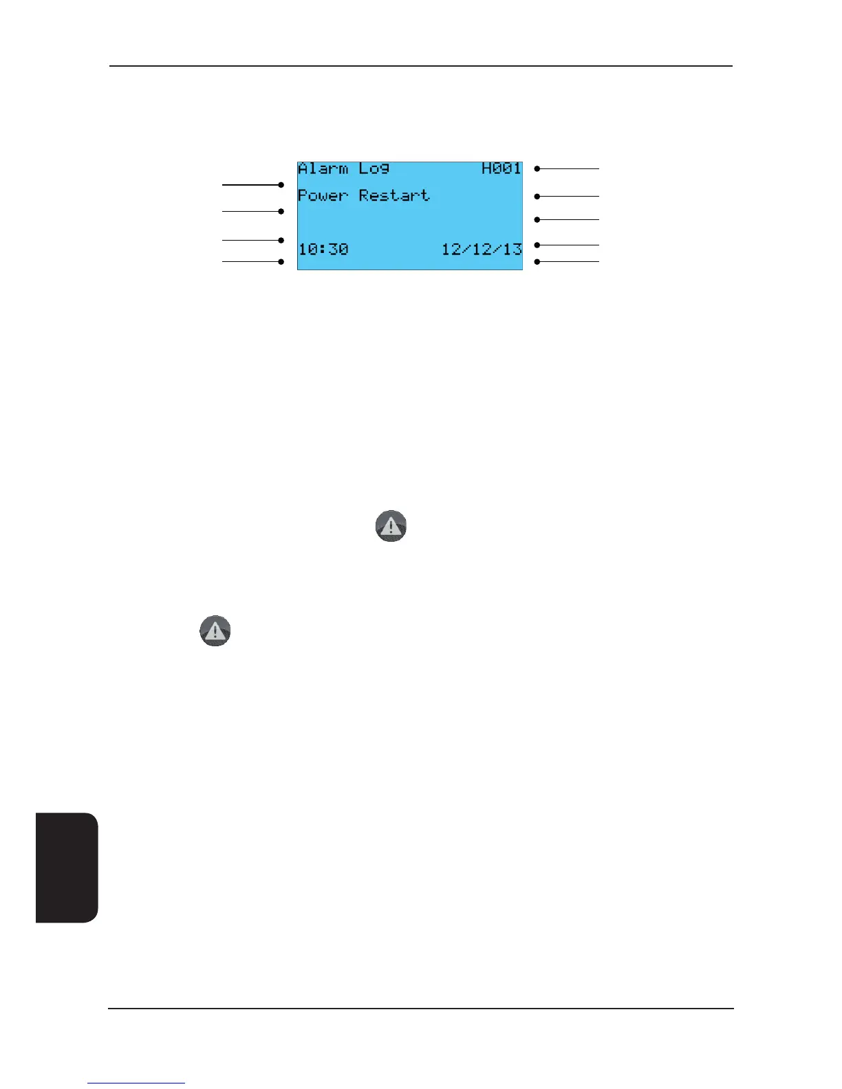 alarm page. Consequently the most recent alarm has the lowest log number (001) and will be displayed upon entering