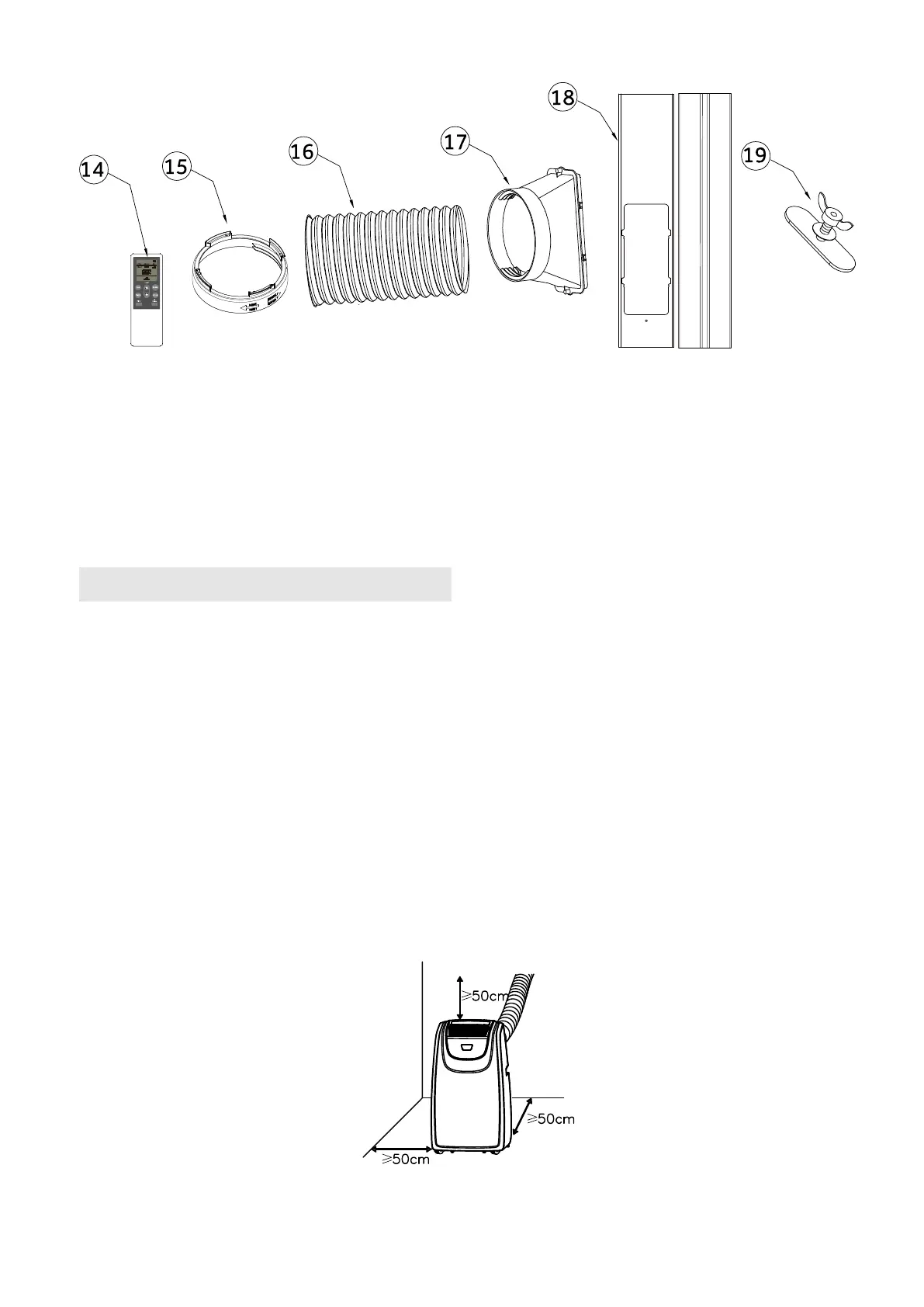 NOTE: A minimum clearance of 50cm from the air condioner to the wall must be maintained to ensure proper airflow.