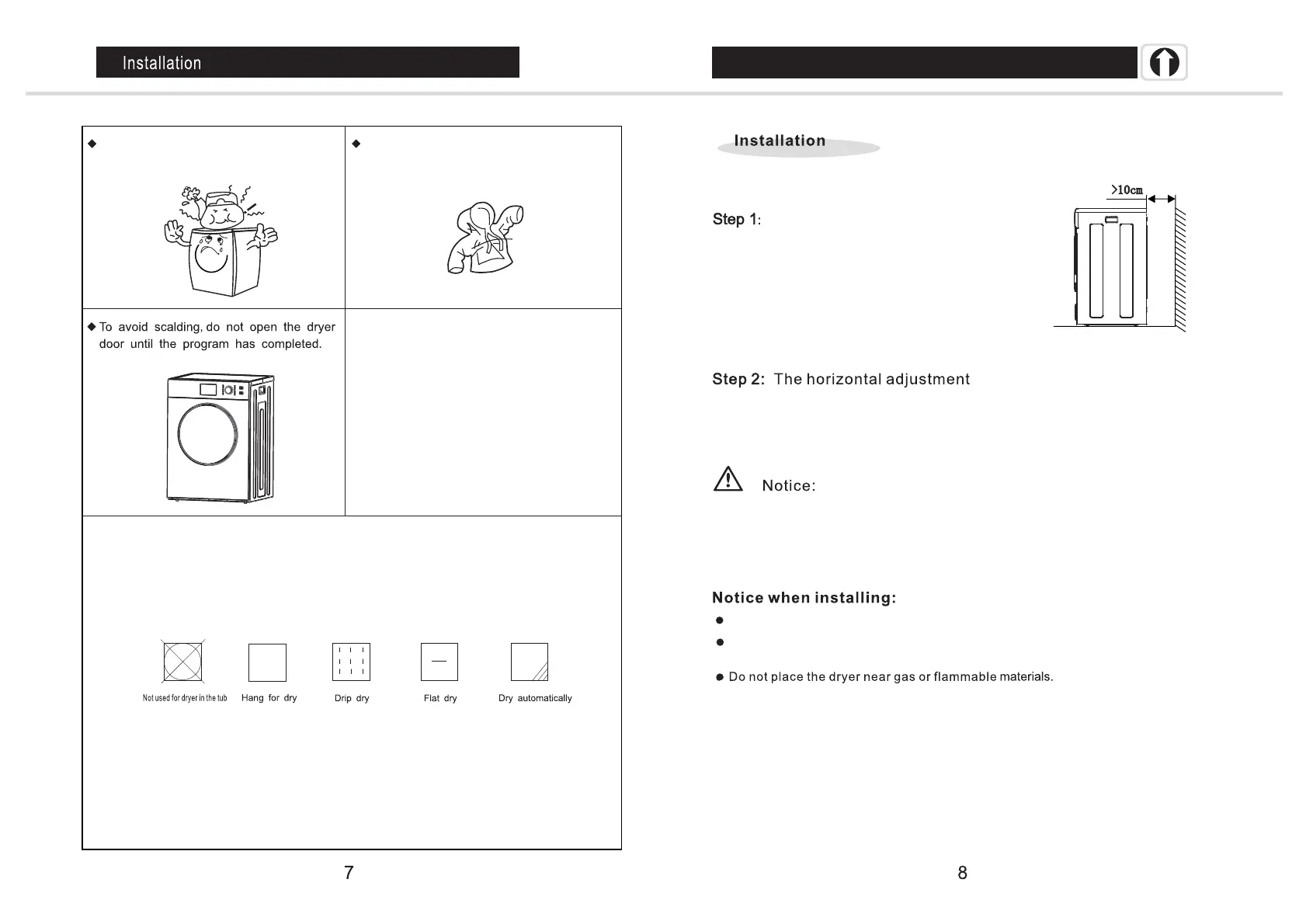 Do not place the Dryer (especially the back of the Dryer) near any curtains or other