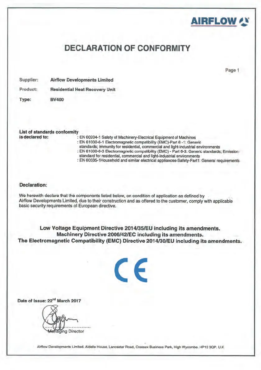 Airflow Duplexvent BV400 - 13 Declaration of Conformity