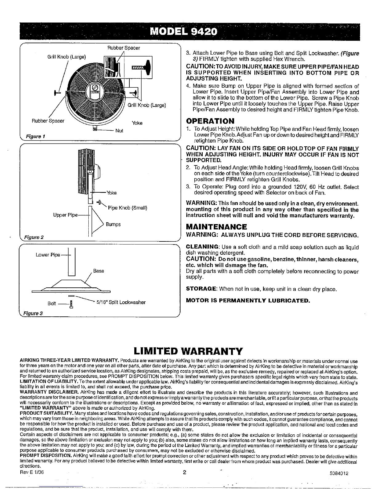 AirKing 9420 - Connecting Pipes; Fan Operation; Adjusting Fan Height; Adjusting Fan Head Angle