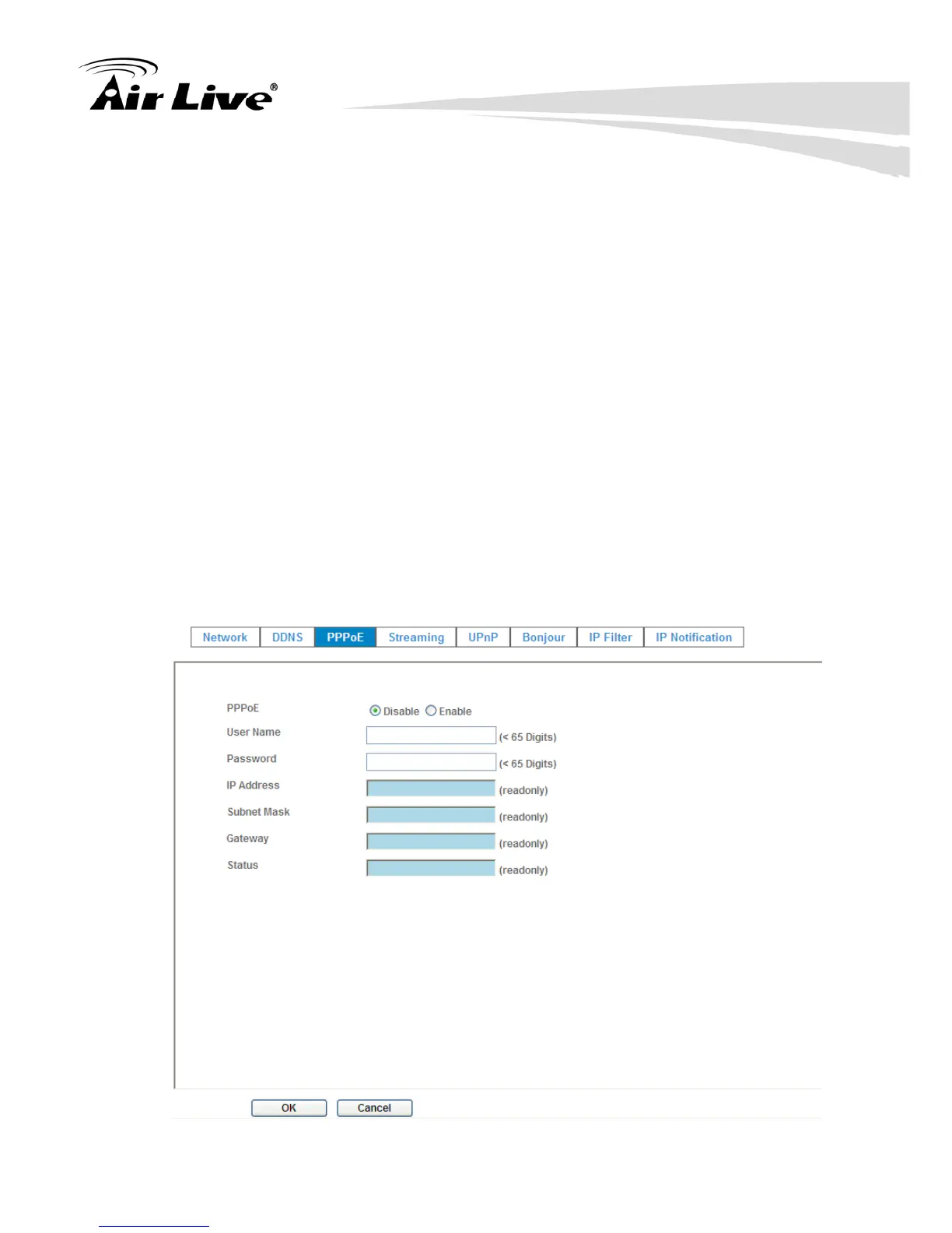• Access the device; enter Setting Î Network Î PPPoE as below