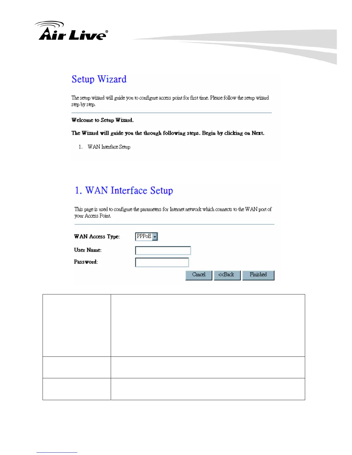 WAN Access Type If the PPPoE be selected, user have to set up the user name and