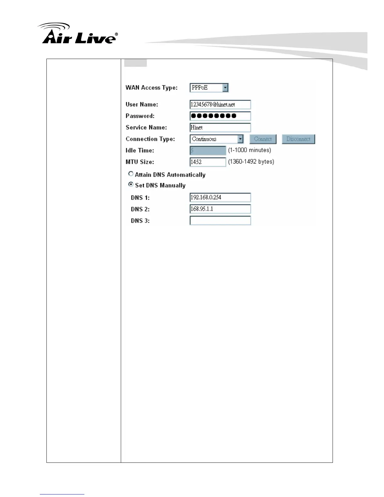 If the PPPoE be selected, user has to set up the user name and