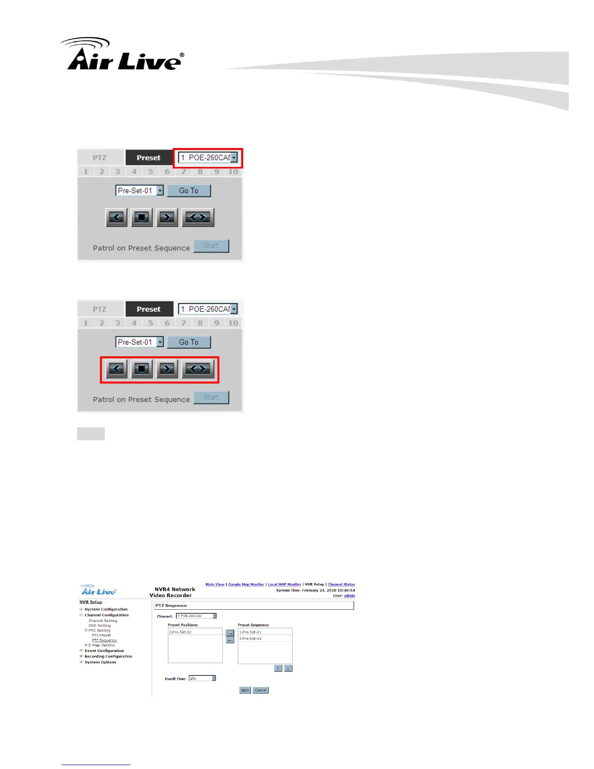 “Channel Configurations” “PTZ Setting” “PTZ Sequence” under the “Setup” menu,