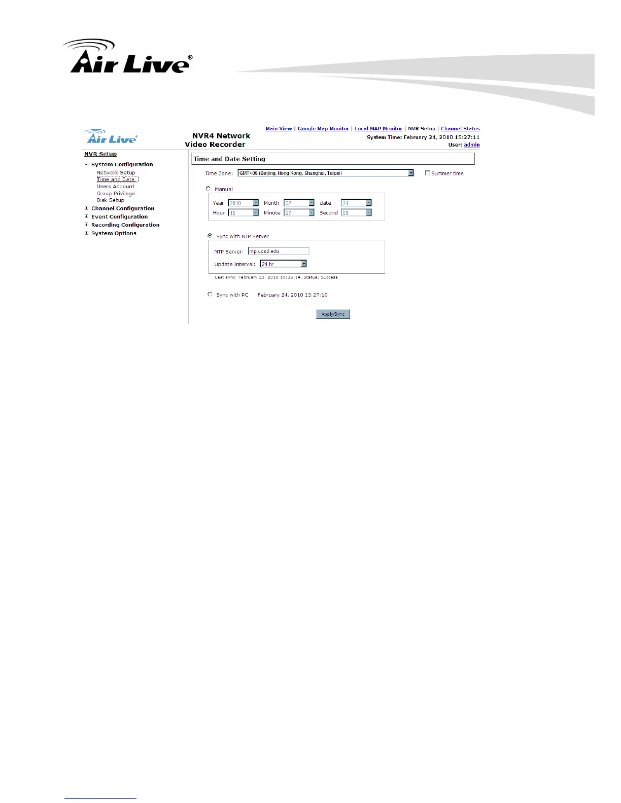 c. Sync with PC – Check this option to synchronize the NVR time with the PC that you