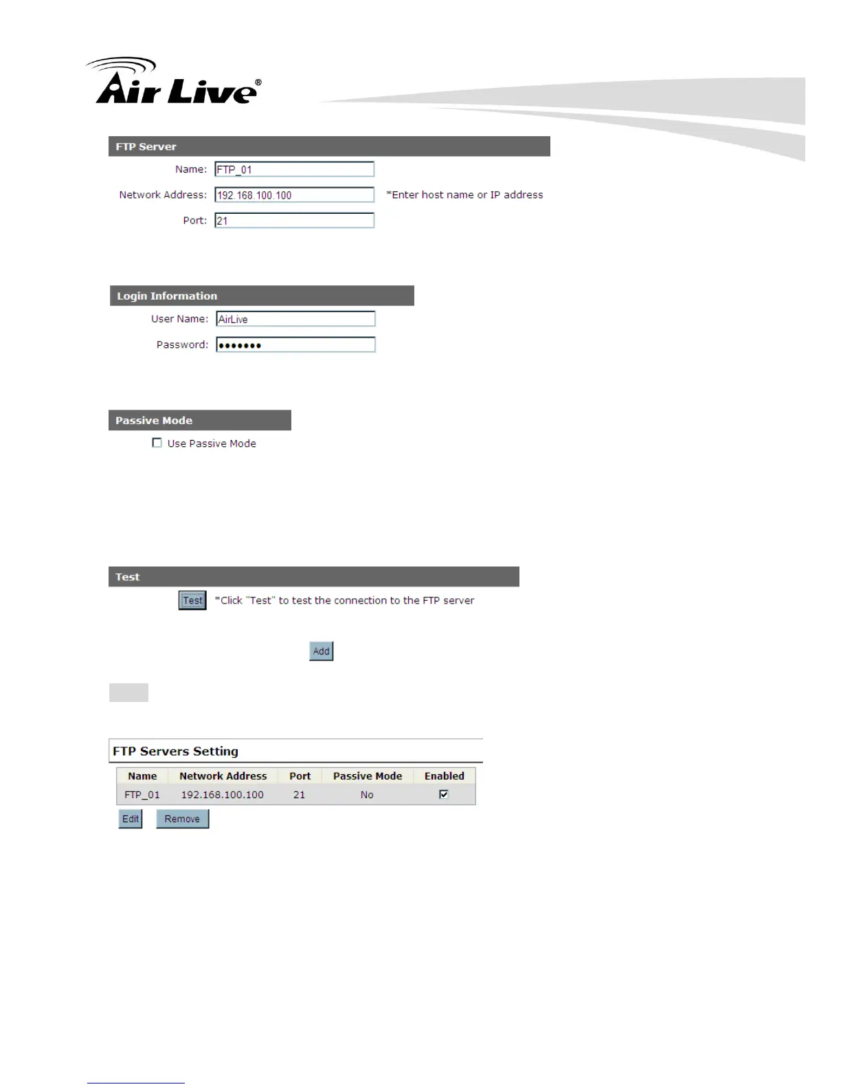 Note: If you wish to edit/remove/enable/disable an FTP server, click to highlight one from