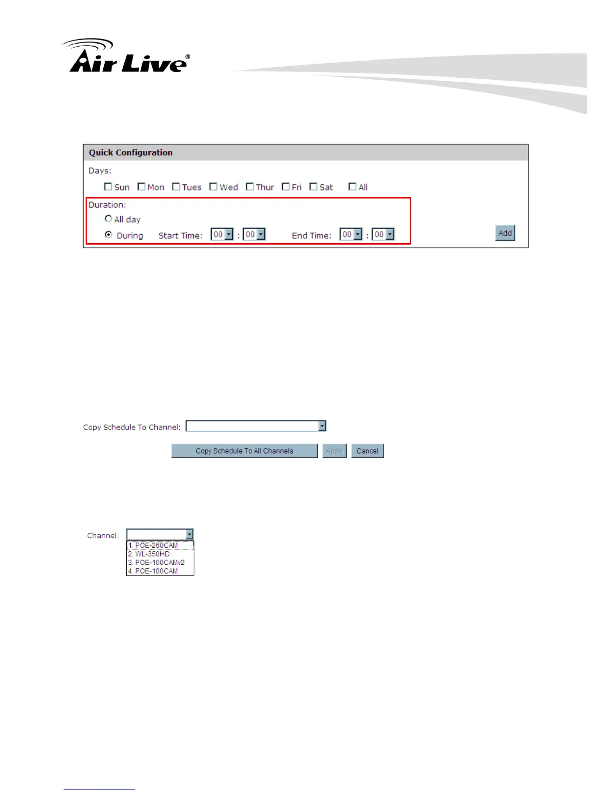 User can use the “Copy Schedule to Channel” function to copy current schedule setting to