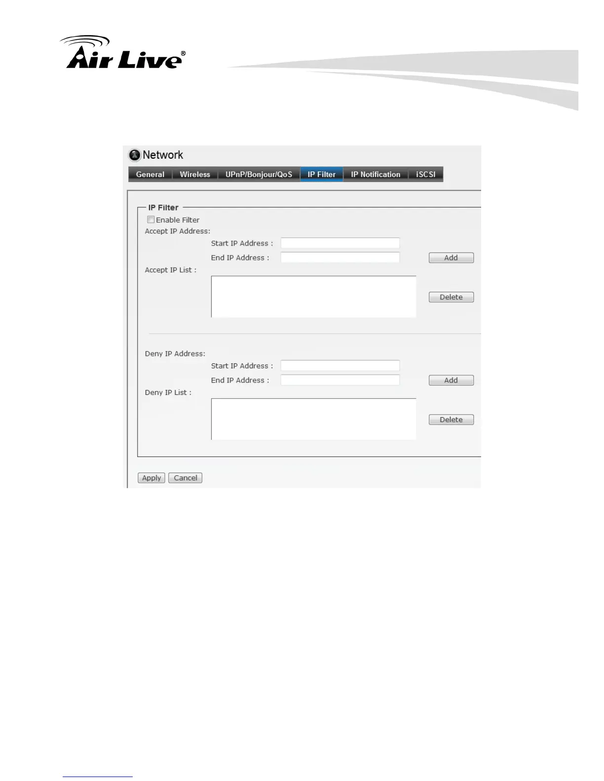 Accept IP Address field; or assign the range of IP addresses that are blocked to