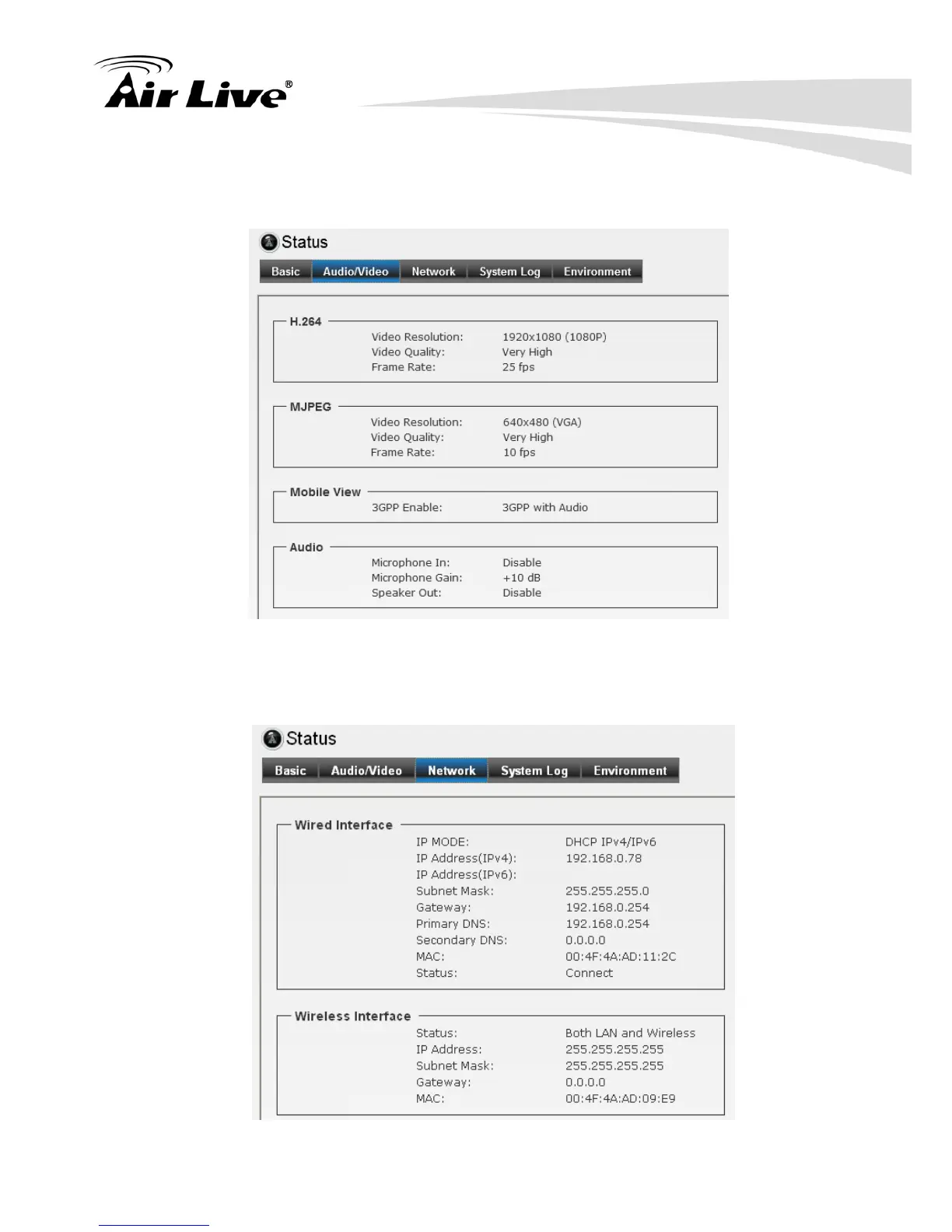 It provides the information including H.264/MJPEG/Mobile View/Audio as below.
