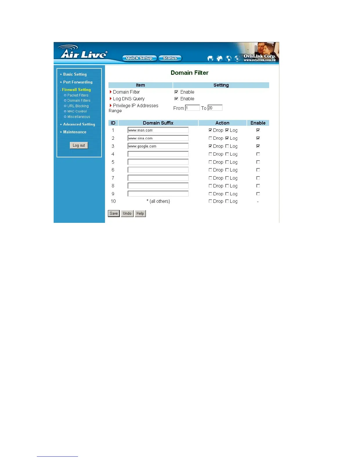1. URL include “www.msn.com” will be blocked, and the action will be record in log-file.