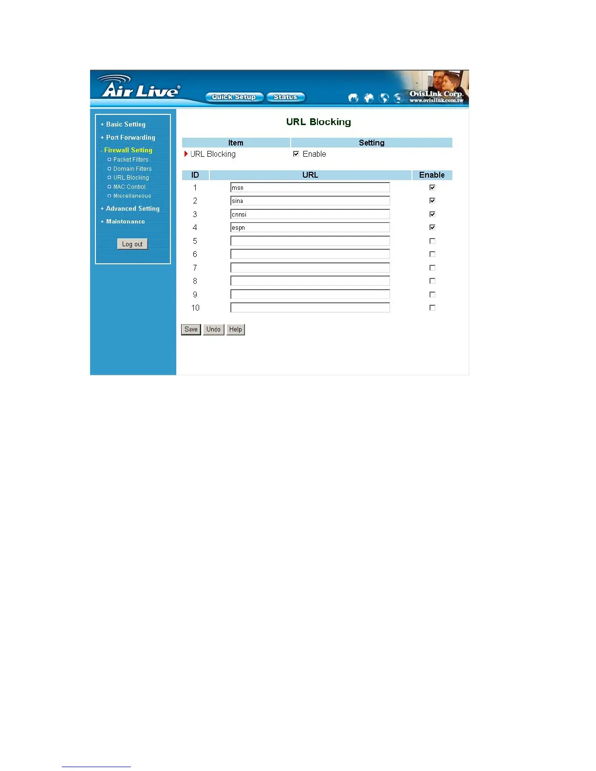 1. URL include “msn” will be blocked, and the action will be record in log-file.