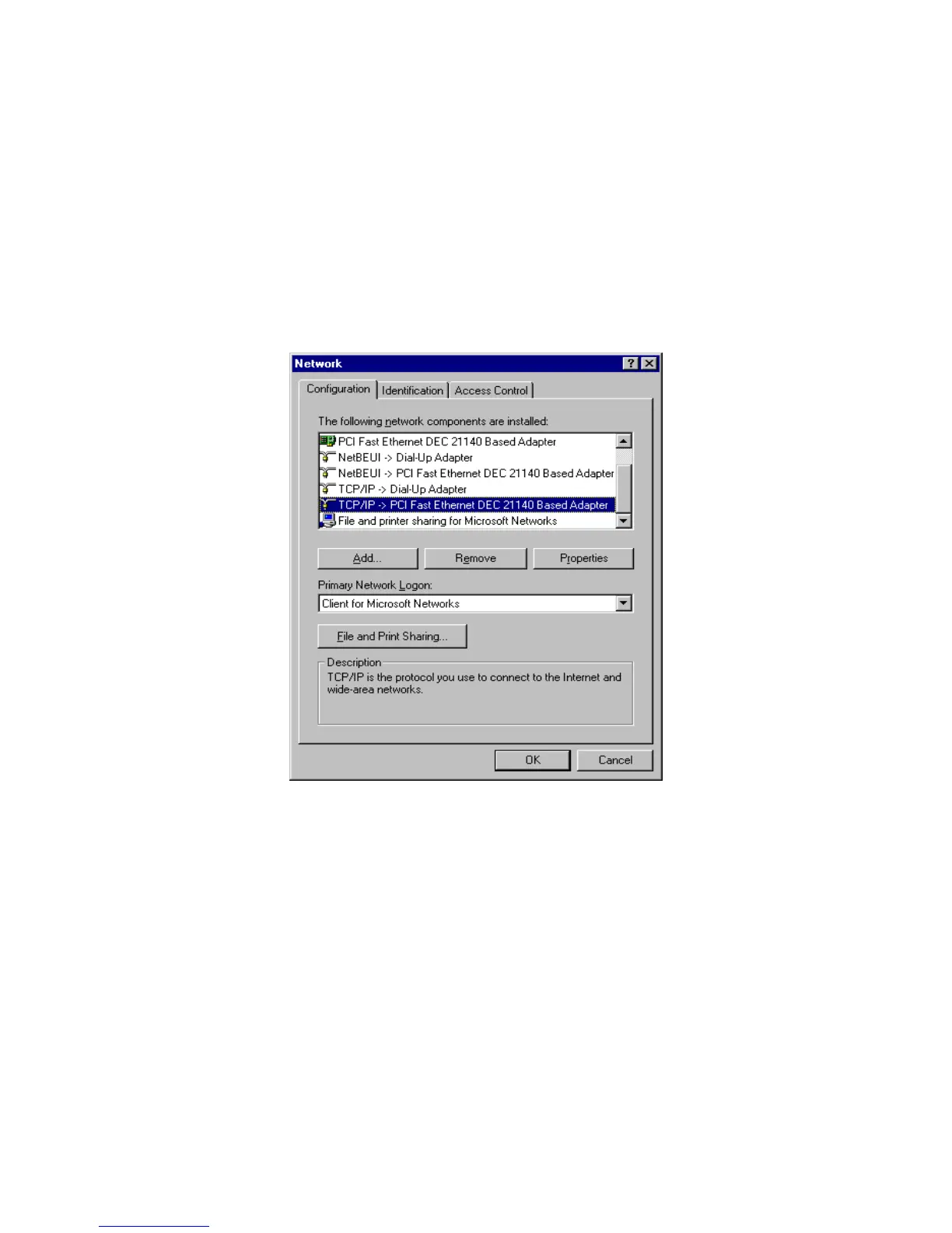 6. The TCP/IP protocol shall be listed in the Network window. Click OK to complete the install procedure and