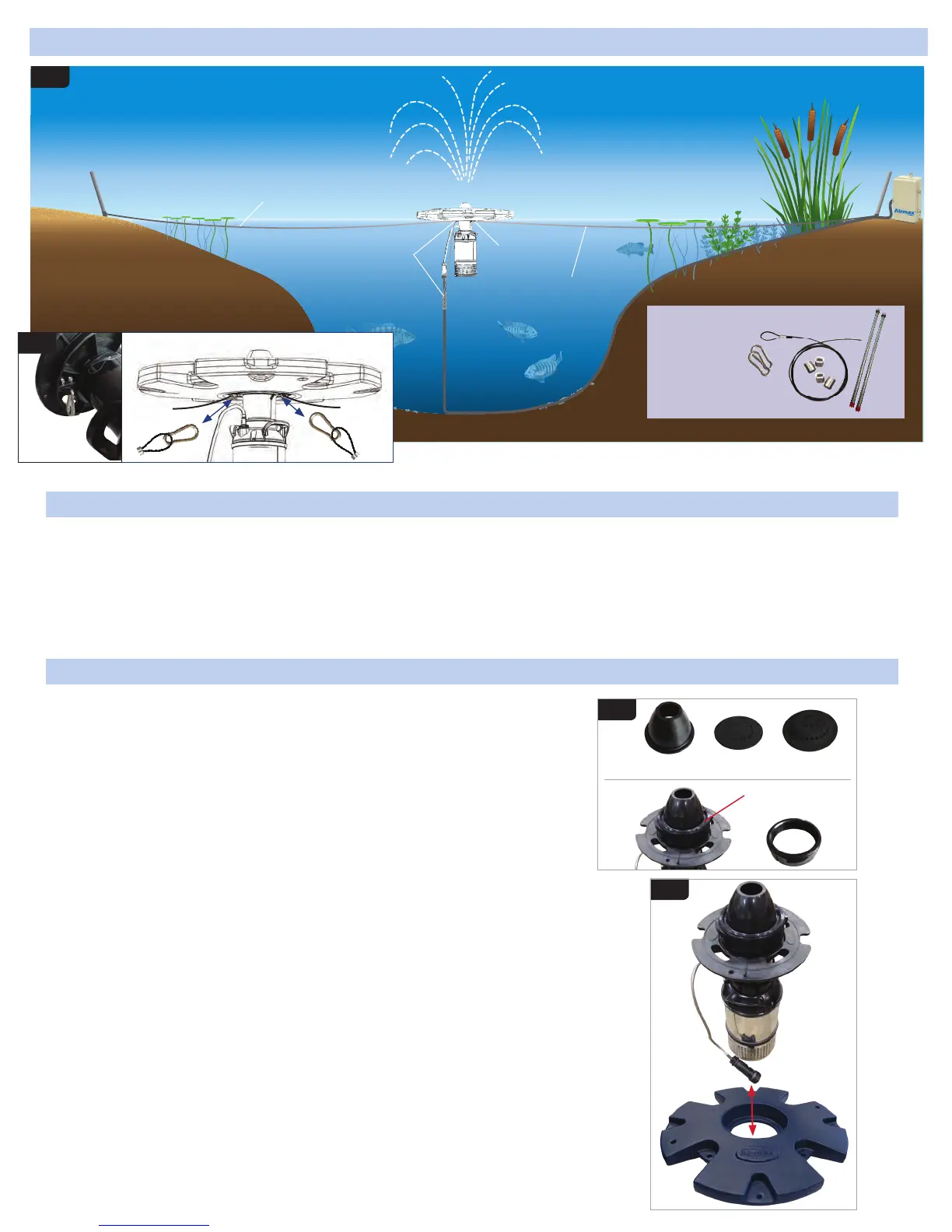 g) Pick up the fountain by the float and place into the water. Note: a minimum of 24” of water is