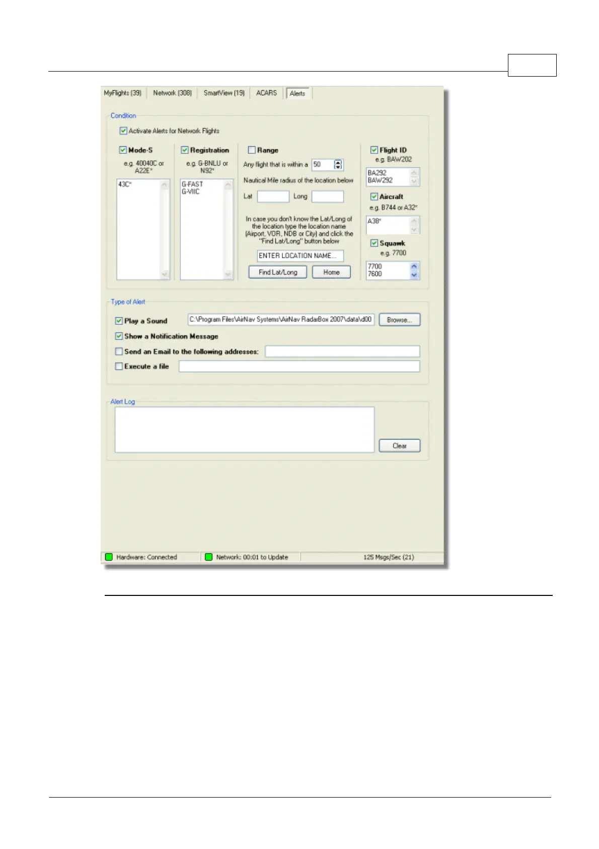 · Mode-S: when an aircraft with a specific mode-s has been received an alert is triggered