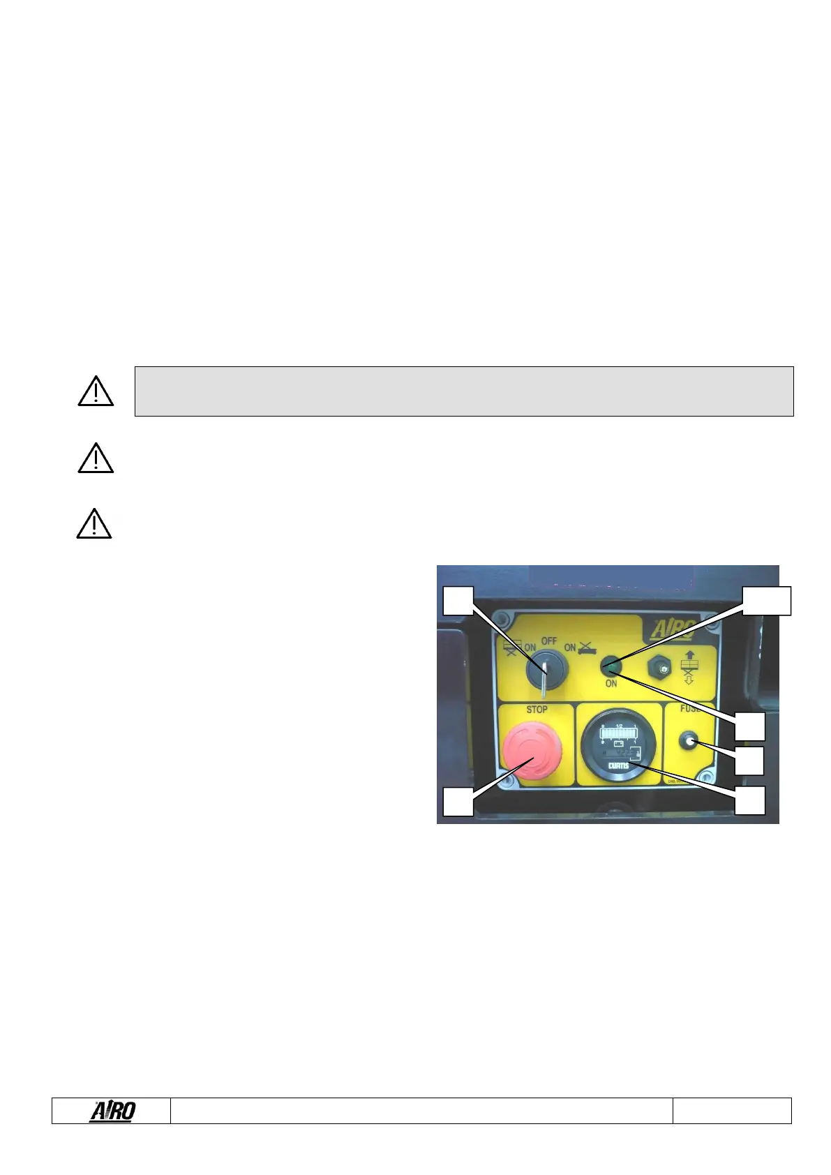 The hour-meter displays the working hours of the electric pump. Platform lowering occurs by gravity and does not require the