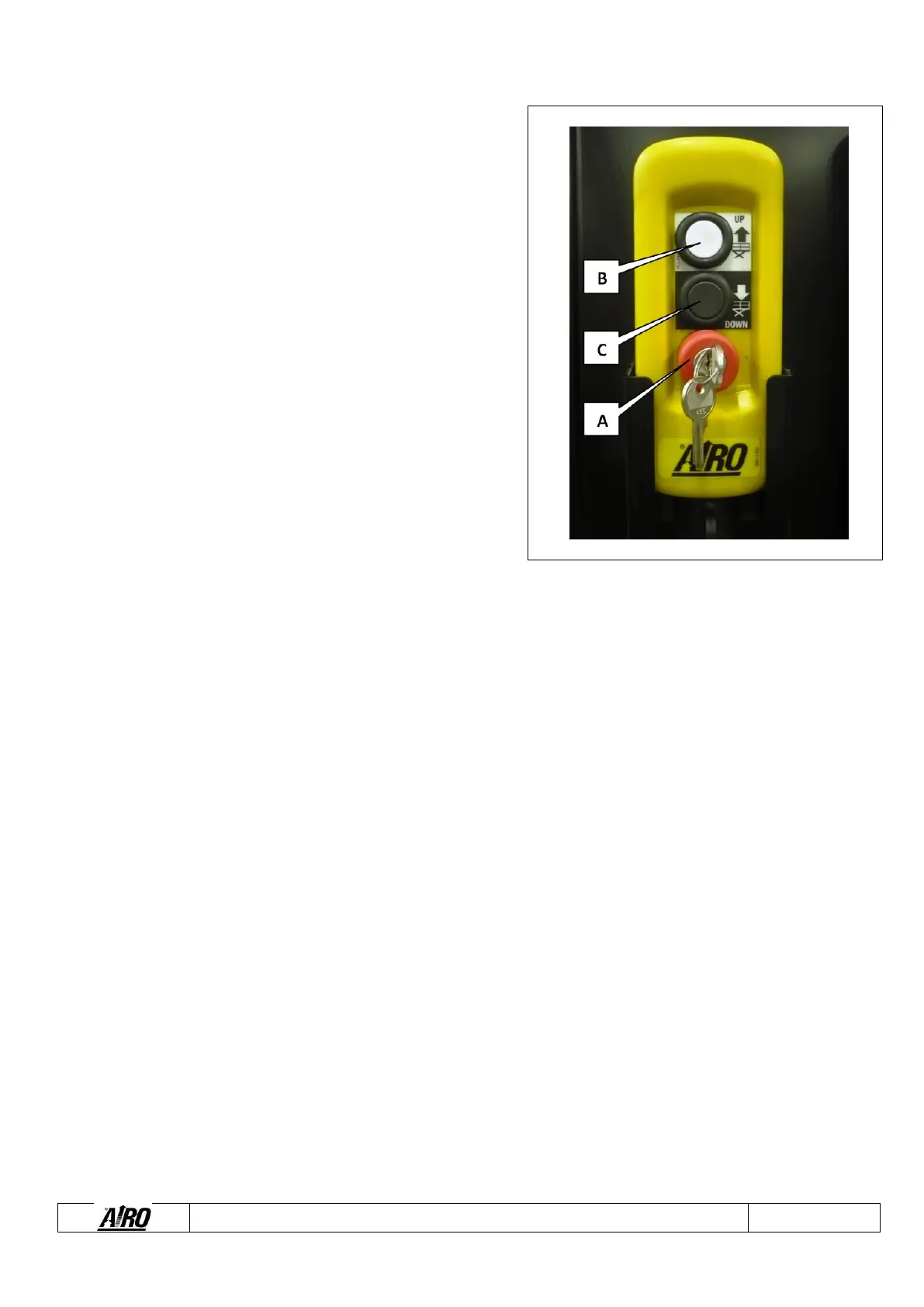 To lift and lower the platform it is necessary to operate button B) for lifting and C) for lowering holding them pressed during the