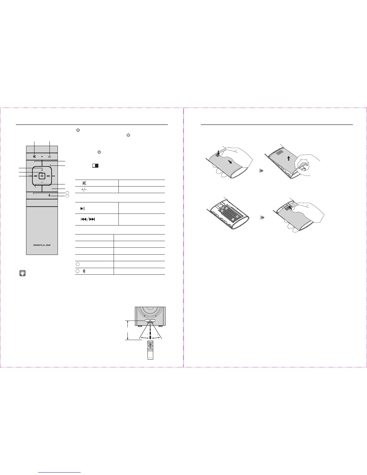 2. Place the two AAA baeries (note the “+” and “-”pole) into the remote control and