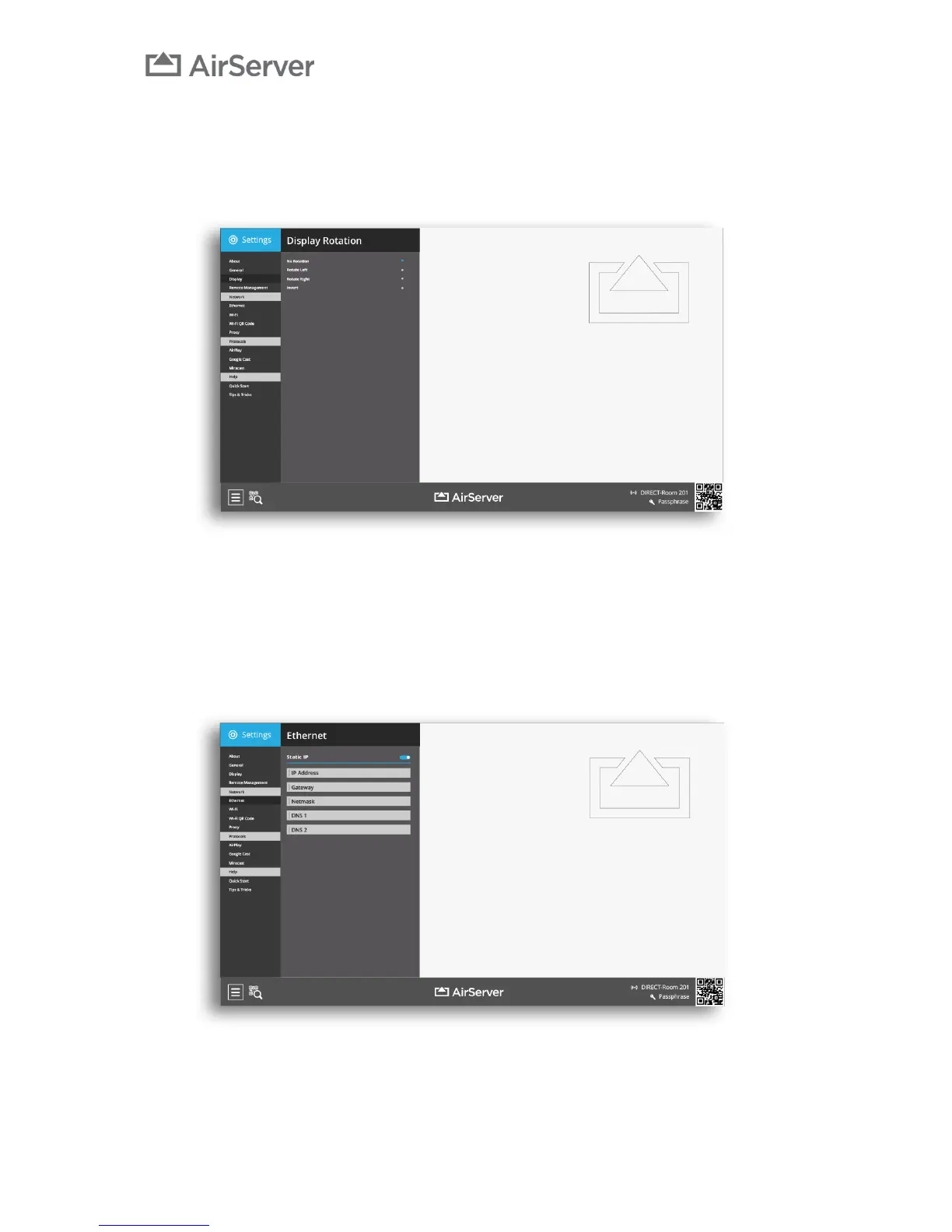 Static IP, the AirServer Connect will contact the DHCP server to get a dynamic IP address, gateway, subnet