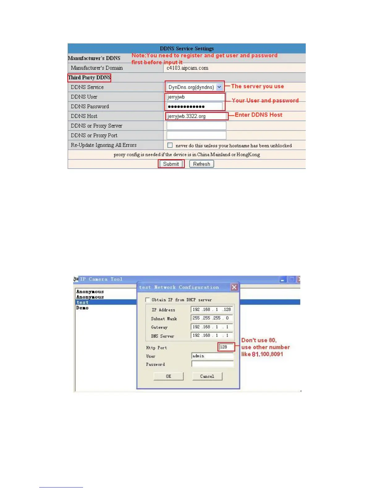The default port of camera is “80”, please change “80” to any other one you like, such as “81”, “100”, “8091”