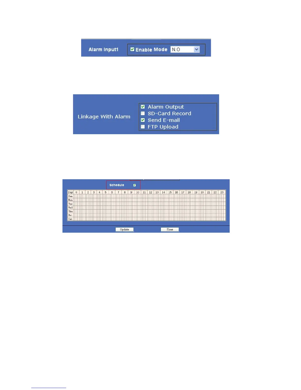 ● Alarm Input: (Refers to the I/O input 1). Set alarm input ON/OFF, (it supports NO/NC external alarm device),