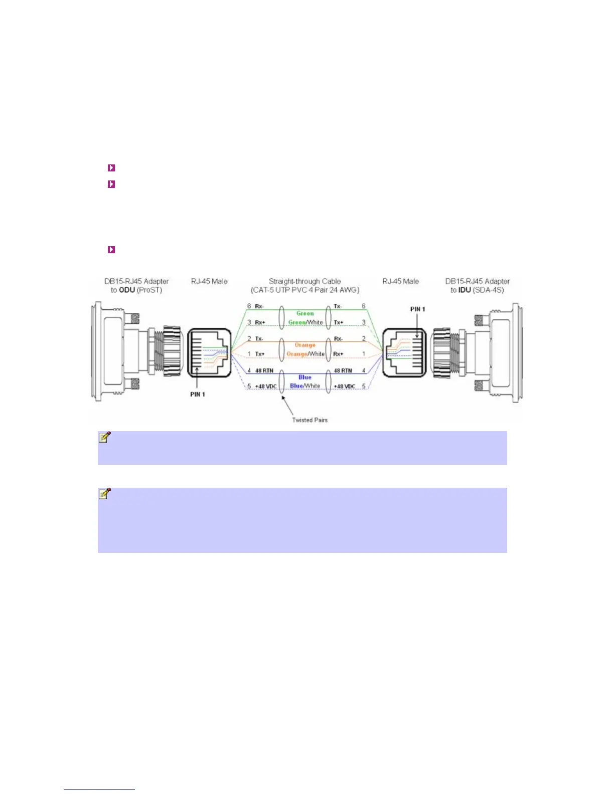The ODU-to-IDU connectivity implements a CAT 5 cable with 8-pin RJ-45 connectors at either