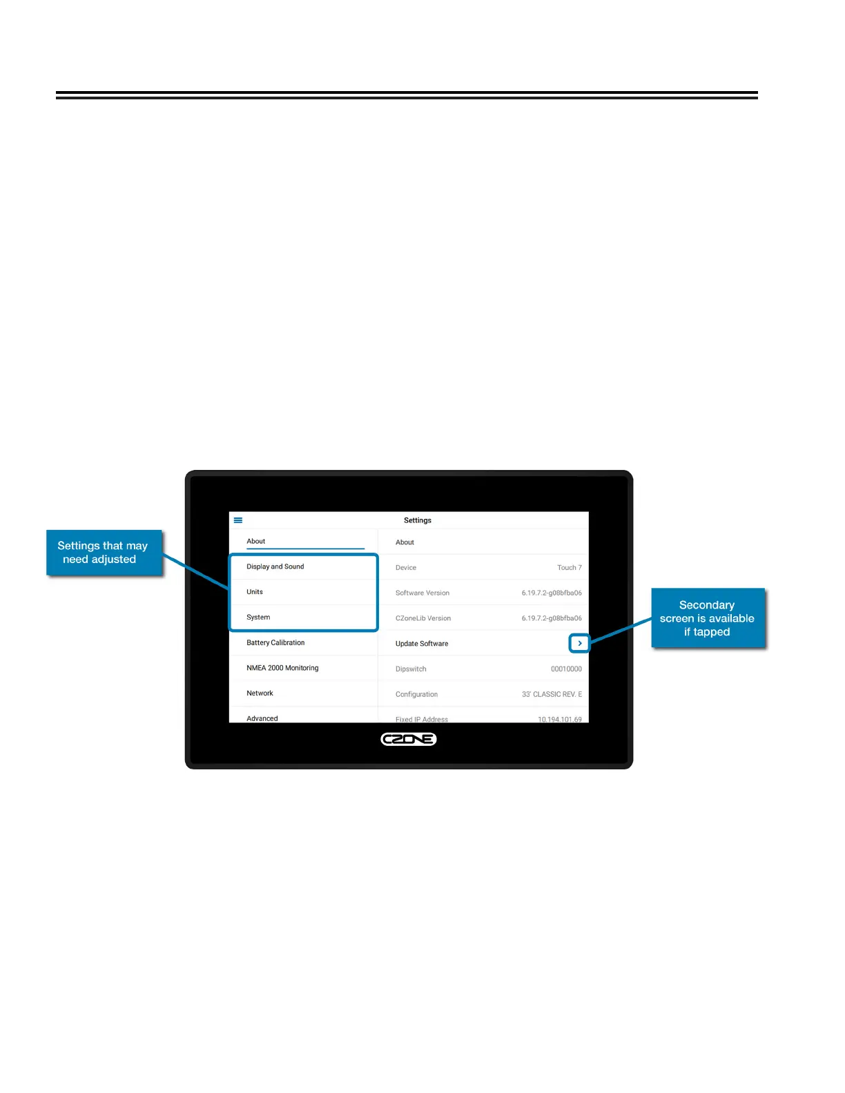 the system to quit operating completely. Changing of CZone® system settings via the touch screen control panel