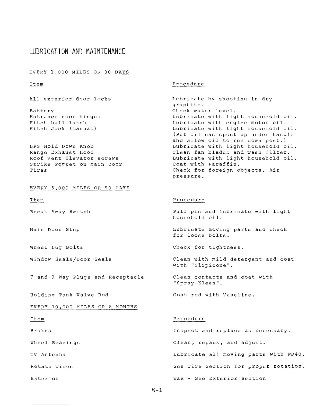 Airstream EXCELLA 1985 - LUBRICATION & MAINTENANCE SCHEDULE