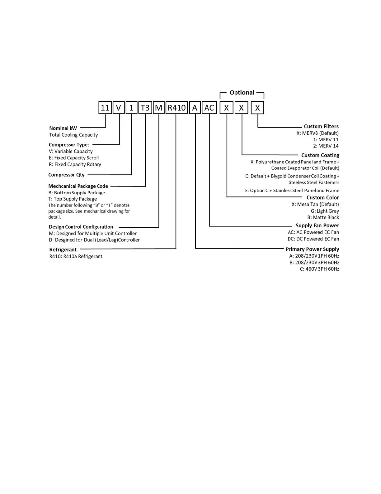 Each unit is identified by a model number, such as 11V1T3MR410AAC. The elements in the number are